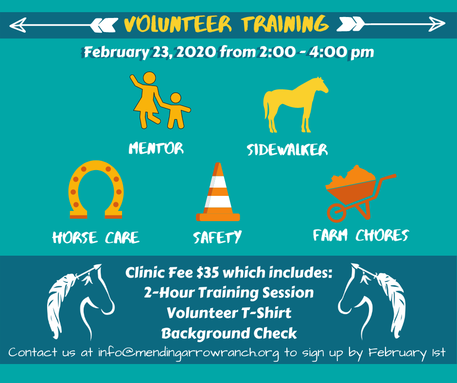 Additional Evidence: Mending Arrow Ranch does not have a specified volunteer coordinator due to the small staff size of the organization. My supervisor and I found that many of the volunteers at the Ranch showed up unorganized and unclear on basic safety and instructions. We decided to set up a day for a volunteer training workshop, and individuals would be required to attend in order to obtain volunteer hours at anytime during the year at the Ranch (whether for school or other organizations). This training included information about safety, side-walking, mentoring students, basic horse care, and farm chores. I assisted my supervisor in planning and teaching the topics listed, and designed a social media post with event details.