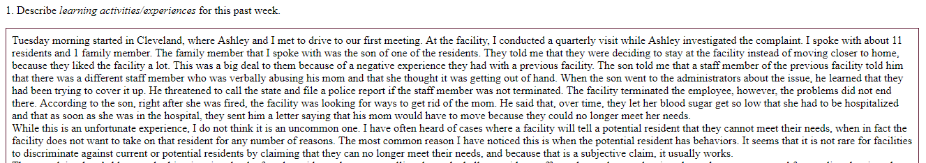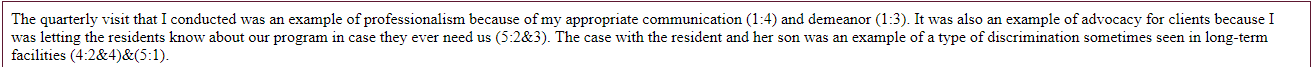 Field: I demonstrated this practice behavior by discussing, in my weekly journal, ways in which I have seen discrimination occur in long-term care facilities.
