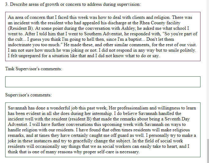 Field: I demonstrated this practice behavior when I appropriately handled situation where a resident criticized my religious beliefs. I described the experience in one of my journals and discussed the issue of handling personal criticism by residents during supervision. I was able to recognize how my personal values might influence my practice and was grew as a professional through this experience.