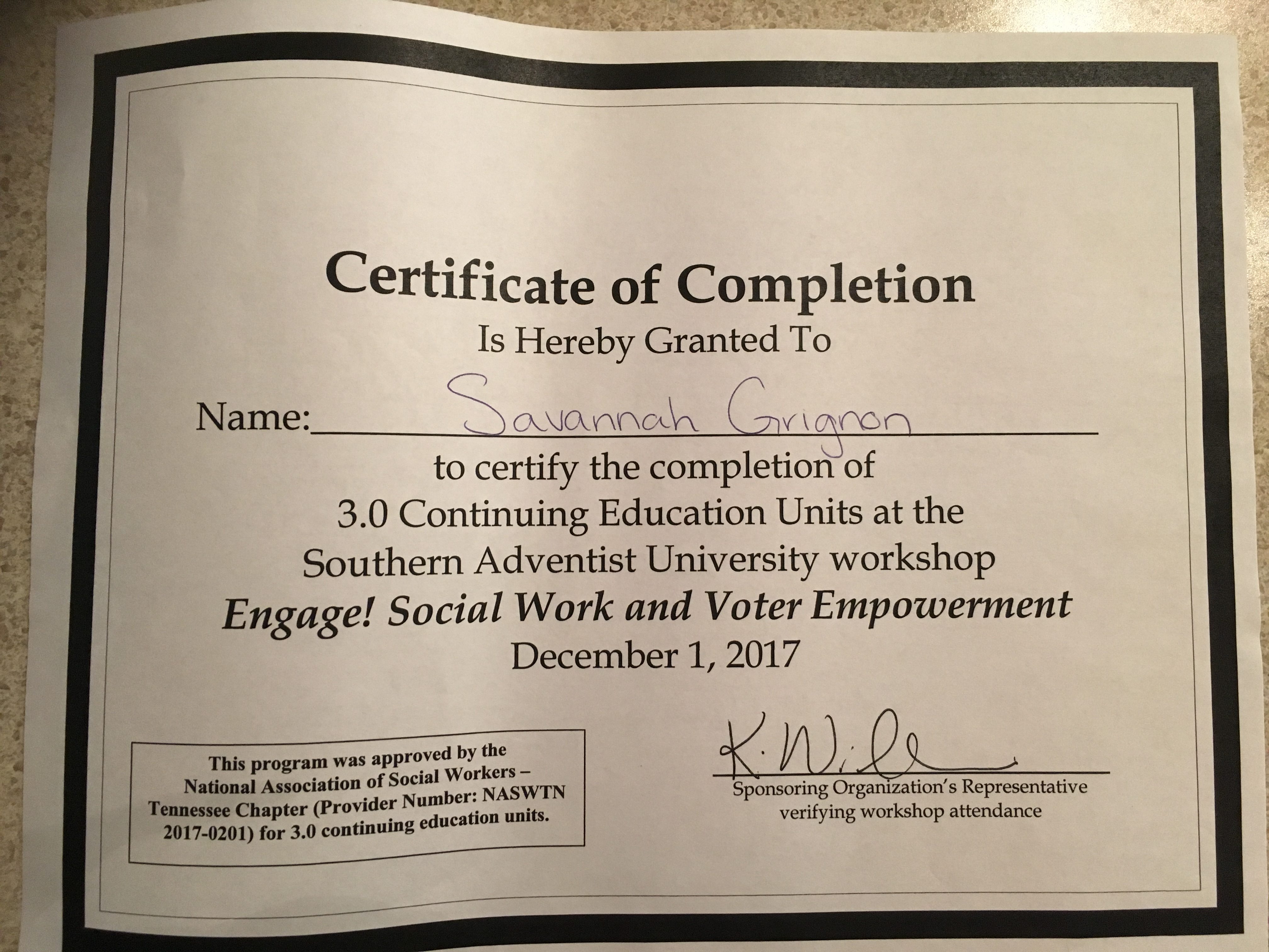 Field: I participated in 3 or more service and educational trainings in addition to the trainings required by the my practicum placement. The educational opportunities that I participated in include a Volunteer Red Cross training on shelter fundamentals on September 7, 2017; the annual Alzheimer’s Conference on November 17, 2017; a Voter Engagement workshop on December 1, 2017; and Social Work Day on the Hill on March 20, 2018.