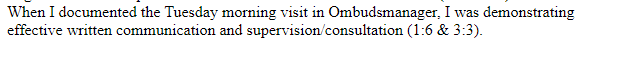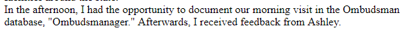Field: I had the opportunity to learn about the process of documentation at my agency into the “Ombudsmanager” database. Below are journal entries of me receiving supervision with documentation.