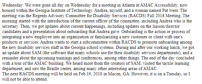 Other: During my internship at Dalton State College, I went to a Regents Advisory Committee for Disability Services (RACDS) meeting in Atlanta at AMAC Accessibility. At the meeting we discussed the disability services that are provided over the whole state of Georgia and how we could improve upon them. Here is an exerpt of my journal from that week.