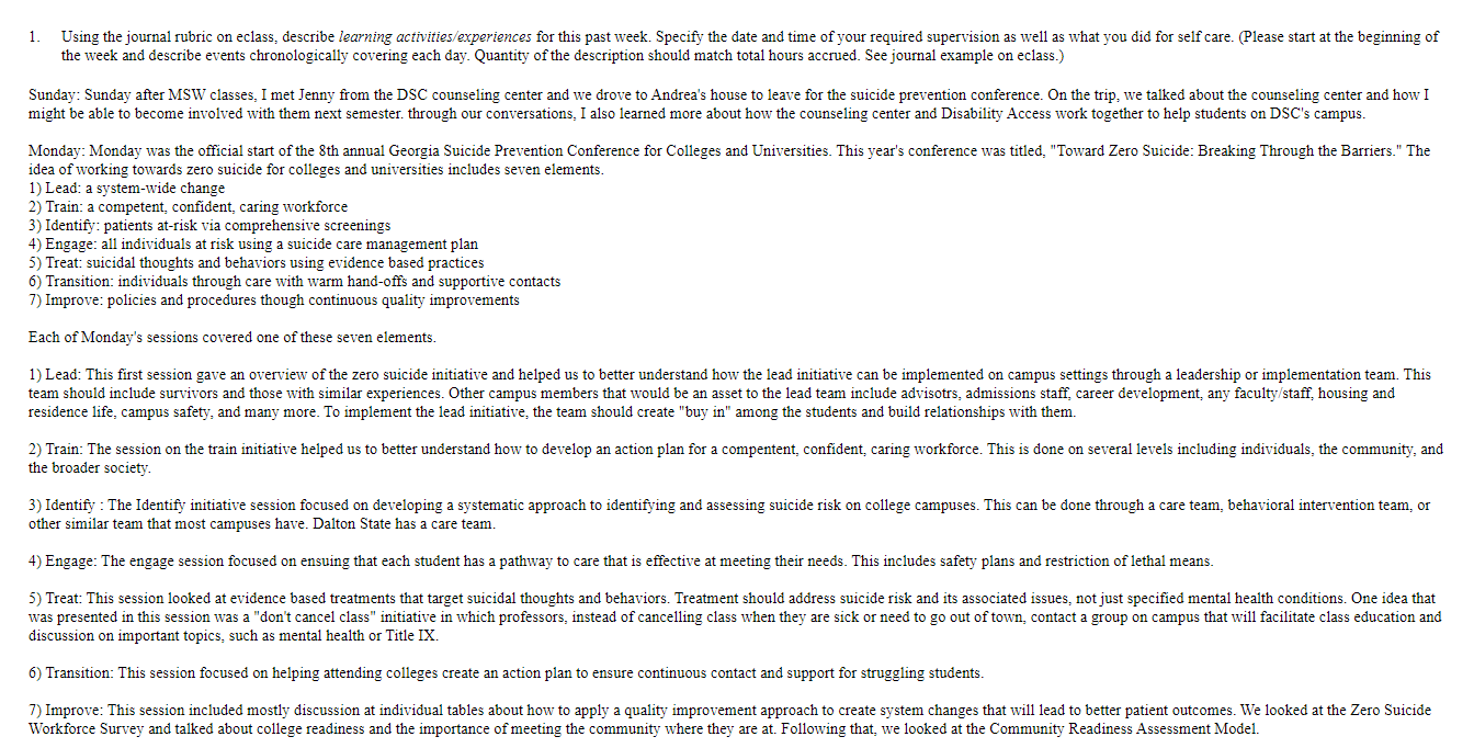 Field: I participated in the annual suicide prevention conference in order to be able to more effectively advocate for students, and other individuals, with mental illnesses. I journaled about what I learned during my time there and used that knowledge when meeting with my clients in Disability Access.