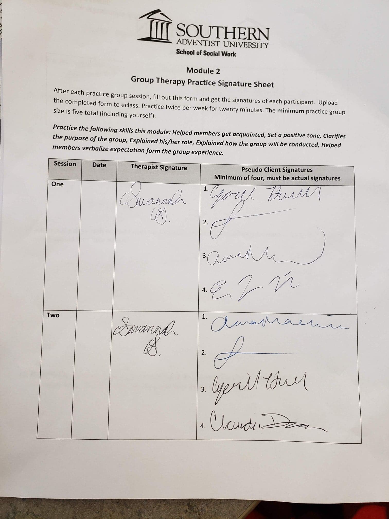 Other: During the winter semester, I learned about evidenced-based strategies for group therapy and had the opportunity to engage with a group of pseudo-clients each week in order to sharpen my skills as a group clinician. Here is a record form for one of my weeks of practice.