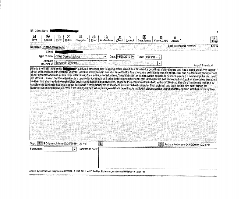 Field: During the spring 2019 semester, I met with several students per week, and met with one regular student for approximately 12 weeks, in order to assist them with their individual disability intervention needs. Here is a casenote I completed on her, with identifying information blacked-out.