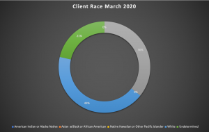 In my field placement, I am a member of the diversity committee for the American Red Cross SETN Chapter. As part of this research, we have compiled information on the demographics of clients and volunteers within our chapter to ensure we are serving everyone. This information will be used in the future to determine the way service delivery happens with clients and to ensure that the scope of the SETN American Red Cross is as far-reaching and inclusive as possible. I have put together a graph of the client demographics for March of 2020. As you can see below, our chapter has predominately white and African American clients.